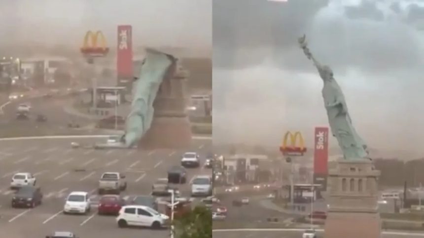 नई दिल्ली (नेहा): ब्राजील के गुआइबा शहर में तेज तूफान में 40-मीटर ऊंची ‘स्टैच्यू ऑफ लिबर्टी’ गिर गई। ये मूर्ति यूनाइटेड स्टेट्स के न्यूयार्क शहर में स्थित स्टैच्यू ऑफ लिबर्टी की रेप्लिका है। लोकल अथॉरिटी के मुताबिक इस मूर्ति के गिरने से किसी तरह का कोई नुकसान नहीं हुआ है। गुआइबा में सोमवार, 15 दिसंबर 2025 की दोपहर तेज आंधी-तूफान आया। ये स्टैच्यू ऑफ लिबर्टी की रेप्लिका हावन के एक बड़े रिटेल स्टोर के पार्किंग स्थल में फास्ट-फूड आउटलेट के पास बनी थी। जब इस स्टैच्यू से आकर तेज हवाएं टकराईं, तो ये पूरी तरह तहस-नहस हो गई।