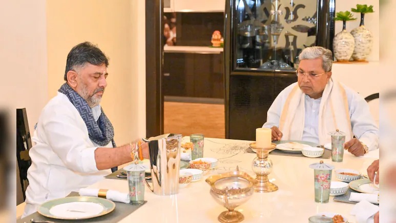 नई दिल्ली (नेहा): कर्नाटक के मुख्‍यमंत्री सिद्धारमैया आज उपमुख्‍यमंत्री डीके शिवकुमार के घर नाश्‍ता करने पहुंचे। ब्रेकफास्‍ट में दोनों ने इडली और चिकन करी का लुत्‍फ उठाया। ब्रेकफास्‍ट टेबल पर बैठे सिद्धारमैया और डीके शिवकुमार की फोटो भी सामने आई है, जो कर्नाटक में मुख्‍यमंत्री की कुर्सी को लेकर चल रही खींचतान के बीच काफी कुछ बयां कर रही है। इससे पहले 29 नवंबर को डीके शिवकुमार ने मुख्‍यमंत्री के घर जाकर सिद्धारमैया के साथ ब्रेकफास्‍ट किया था।